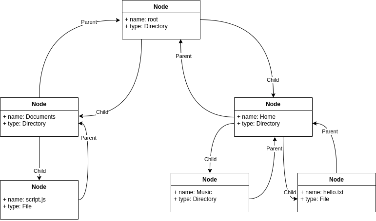 This structure is based on a set of nodes, where each node contains a reference to the parent node and, in the case of a directory, references to the children.